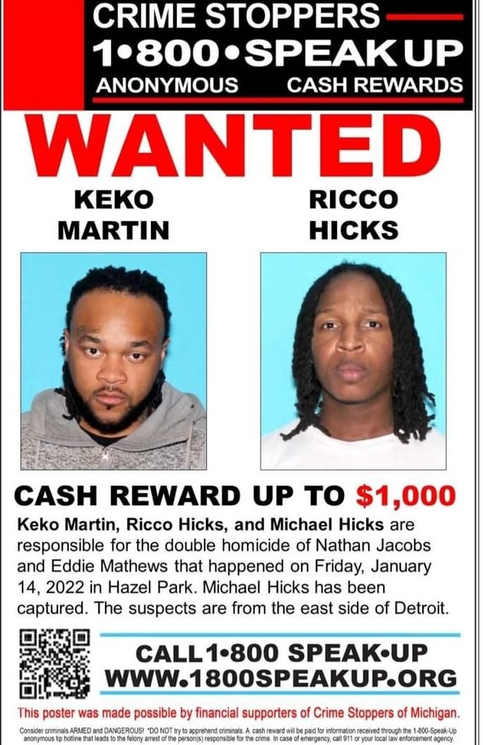 Ricco Hicks y Keko Martin, son buscados por las autoridades por el homicidio de Nathan Jacobs y Eddie Mathews. El crimen ocurrió el 14 de enero de 2022 en Hazel Park.