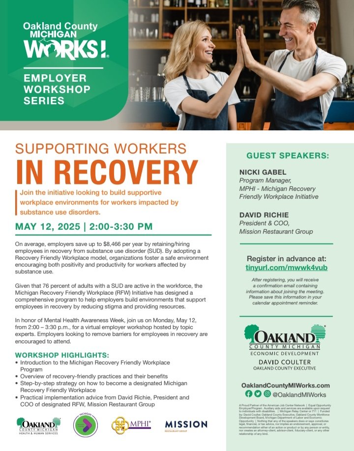 Oakland County, MI – En el marco de la Semana de Concienciación sobre la Salud Mental, el programa Michigan Recovery Friendly Workplace (RFW) ha anunciado un taller virtual dirigido a empleadores, con el objetivo de fomentar espacios de trabajo que apoyen a quienes están en recuperación de trastornos por consumo de sustancias.