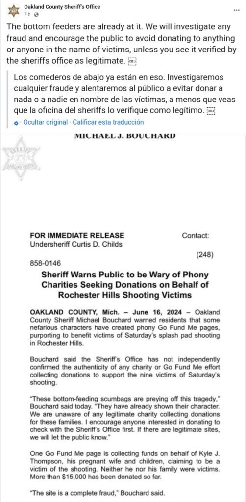 Oakland County, MI – El Sheriff del Condado de Oakland, Michael J. Bouchard, ha emitido una advertencia urgente a los residentes sobre la aparición de páginas fraudulentas de Go Fund Me que pretenden beneficiar a las víctimas del reciente tiroteo en un parque acuático en Rochester Hills.