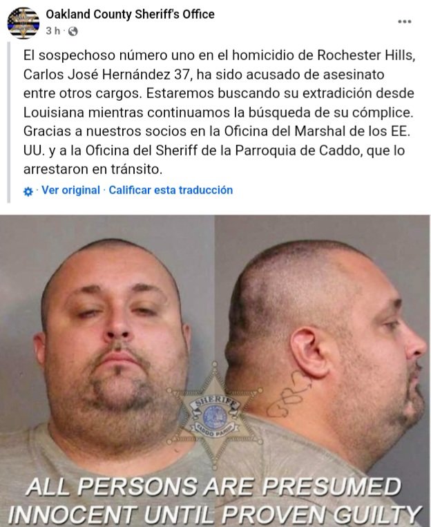 Carlos José Hernández, de 37 años y residente de Dearborn, ha sido acusado por los fiscales del condado de Oakland de homicidio doloso y dos cargos de encarcelamiento ilegal. Hernández fue arrestado el sábado 12 de octubre de 2024 en Shreveport, Luisiana. La Oficina del Sheriff de Caddo Parish dijo que Hernández fue visto viajando hacia el sur por la I-49 desde Arkansas. Los agentes detectaron que el vehículo coincidía con la descripción del vehículo de Hernández, luego lo detuvieron y lo pusieron bajo custodia sin inconvenientes. Según dijeron las autoridades, también es buscado en Ohio por una orden judicial por robo a mano armada.