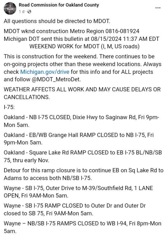 Oakland, MI – El Departamento de Transporte de Michigan (MDOT) dijo que la Autopista I-75 en dirección norte, entre Dixie Highway (Salida 93) y Saginaw Road (Salida 106), estará cerrada desde las 9 p.m. del viernes 16 de agosto de 2024 hasta las 5 a.m. del lunes 19 de agosto de 2024. Además, la rampa de Grange Hall hacia la I-75 en dirección norte también estará cerrada.