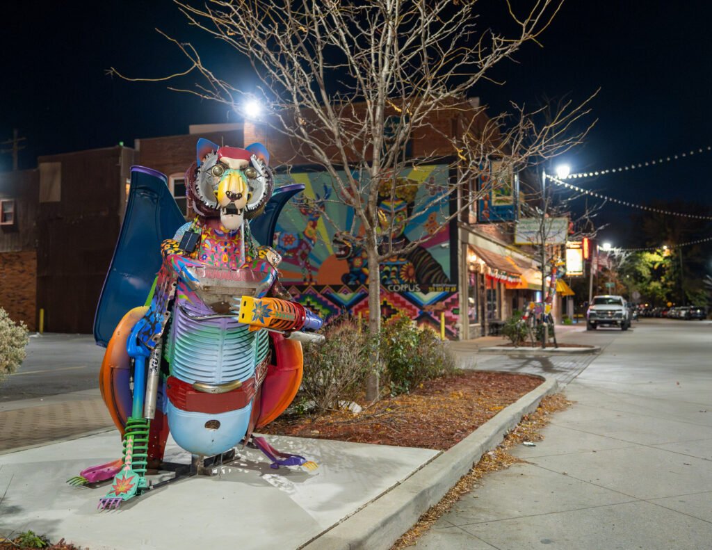 Elton Monroy Duran, who is a Detroit-based visual artist, was selected to create a series of sculptures for the Bagley Street Mexicantown streetscape, «For me, alebrijes are a reflection of us contemporary Mexicans. Alebrijes are usually figures made with different animal parts decorated with cheerful and colorful patterns. We contemporary Mexicans come from an ancient culture that was once fragmented, but which we brought back together, incorporating elements from other cultures to shape our own unique joyful identity,» said Durán. «These alebrijes are made from different vehicle parts and unite our relationship with Detroit and our long-standing contributions as a Latino community to the Motor City.»