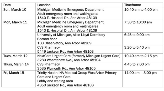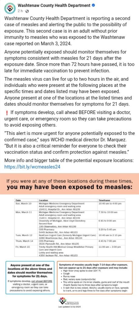 Condado de Washtenaw, Mich. – El Departamento de Salud del Condado de Washtenaw informó un nuevo caso de sarampión y ha proporcionado una lista de posibles lugares de exposición para instar a la comunidad a estar alerta a los síntomas de contagio.