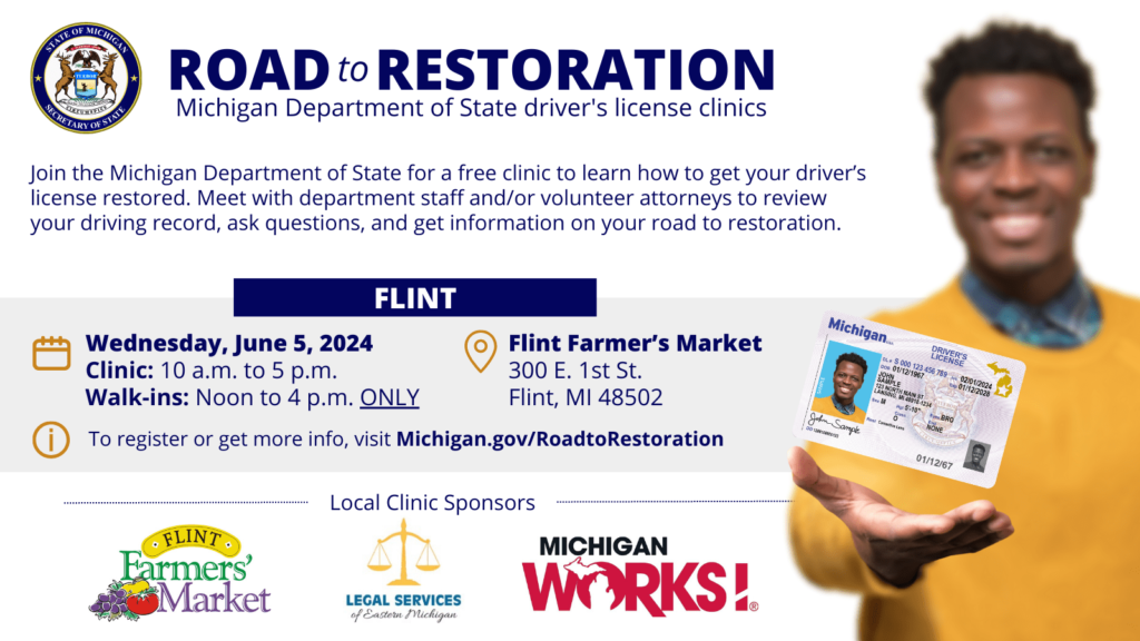 Flint, MI – El pasado 22 de mayo el Departamento de Estado de Michigan (MDOS) y sus socios organizaron una exitosa clínica Road to Restoration en Muskegon Community College, asistiendo a más de 100 participantes locales en el proceso para restaurar sus privilegios de conducir. Este miércoles, 4 de junio, llega la séptima clínica del año a Flint.