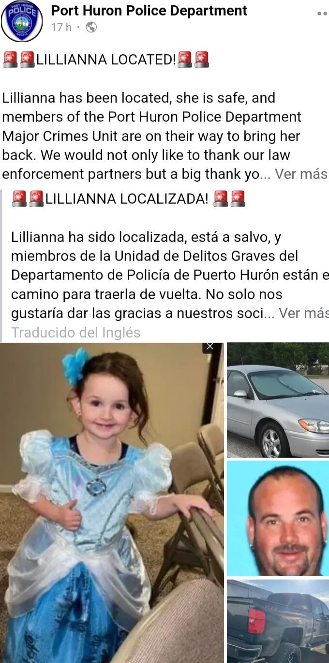 «Lillianna ha sido localizada, está a salvo y los miembros de la Unidad de Delitos Mayores del Departamento de Policía de Port Huron están en camino para traerla de regreso. No solo nos gustaría agradecer a nuestros socios encargados de hacer cumplir la ley, sino también a todos los que compartieron las publicaciones y enviaron todos los consejos. Publicaremos más información a medida que esté disponible», según señalaba el comunicado.