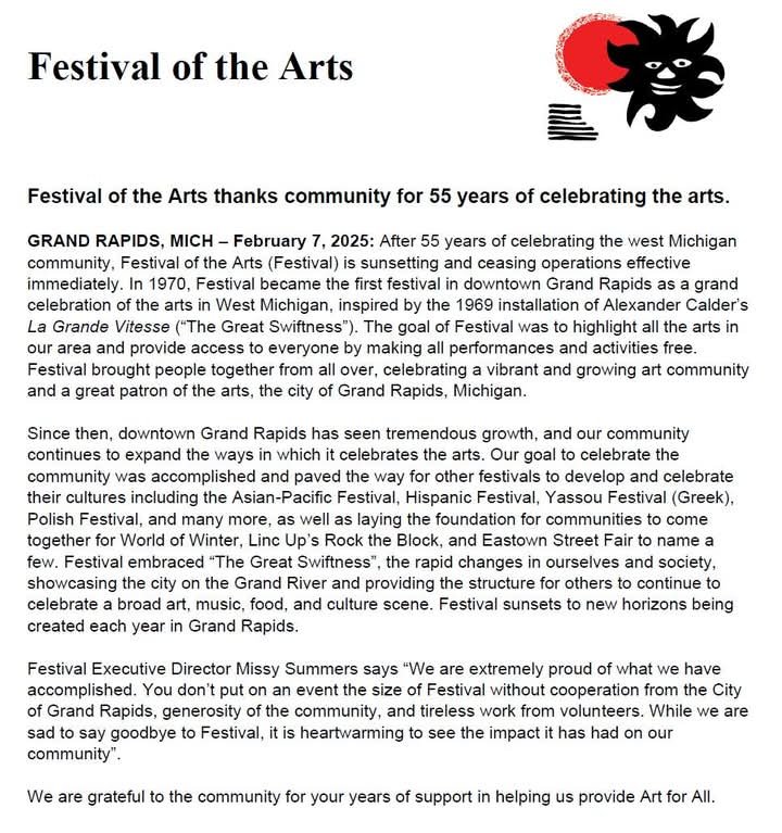 Missy Summers, directora ejecutiva del festival, expresó su orgullo y agradecimiento: «Estamos muy orgullosos de lo que hemos logrado. No se puede organizar un evento de la magnitud del Festival sin la cooperación de la ciudad de Grand Rapids, la generosidad de la comunidad y el trabajo incansable de los voluntarios. Si bien nos entristece despedirnos del Festival, es reconfortante ver el impacto que ha tenido en nuestra comunidad».