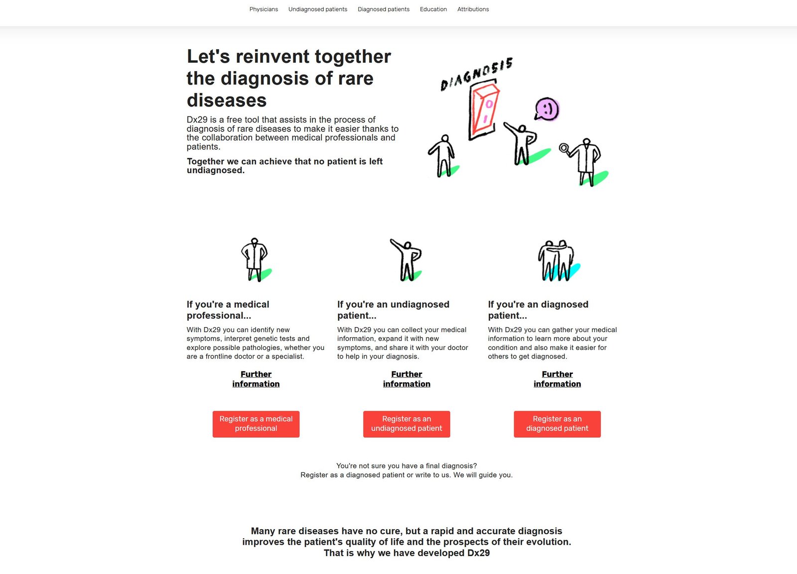 En el caso de las enfermedades raras, los pacientes esperan años, pasan por un sinnúmero de visitas al médico y se someten a tratamientos no exitosos antes de encontrar un diagnóstico definitivo. Con la DX29 estos tiempos se acortan considerablemente, pues detrás de la tecnología y la inteligencia artificial, hay información e investigación médica verificable que hace que la mayoría de pacientes que registran sus síntomas encuentren aquí un diagnóstico acertado.