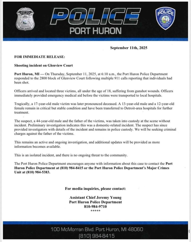 Según informó el Departamento de Policía de Port Huron, las autoridades respondieron al llamado de emergencia a las 6:10 a. m., tras recibir múltiples reportes al 911 sobre personas heridas por arma de fuego. Al llegar al lugar, los agentes encontraron a tres menores con lesiones provocadas por disparos. Los oficiales brindaron atención inicial en el sitio antes de que las víctimas fueran trasladadas de urgencia a centros médicos locales.