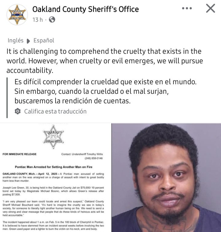 Pontiac, MI – En un caso que ha conmocionado a la comunidad, Joseph Lee Green, de 30 años, fue arrestado y procesado por cargos de agresión con intención de causar lesiones corporales graves. El incidente, ocurrido el pasado 5 de febrero en la cuadra 100 de Cherryhill, involucró un ataque en el que Green utilizó papel y un encendedor para quemar a un hombre de 49 años, residente de Pontiac, en el cuello, el brazo y el cuerpo.