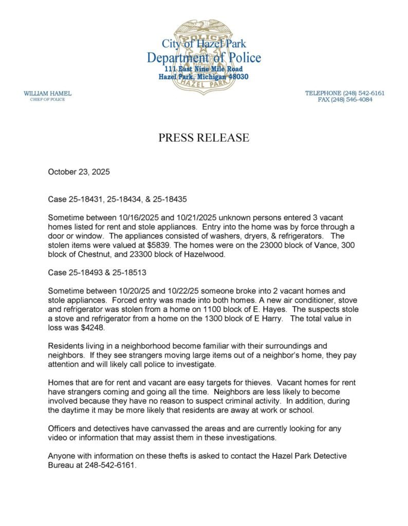 Hazel Park, MI — La Policía de Hazel Park está investigando una serie de robos ocurridos recientemente en viviendas vacías y disponibles para alquiler. Según el informe oficial, entre el 16 y el 22 de octubre, varias casas fueron forzadas por desconocidos que se llevaron electrodomésticos de alto valor.
