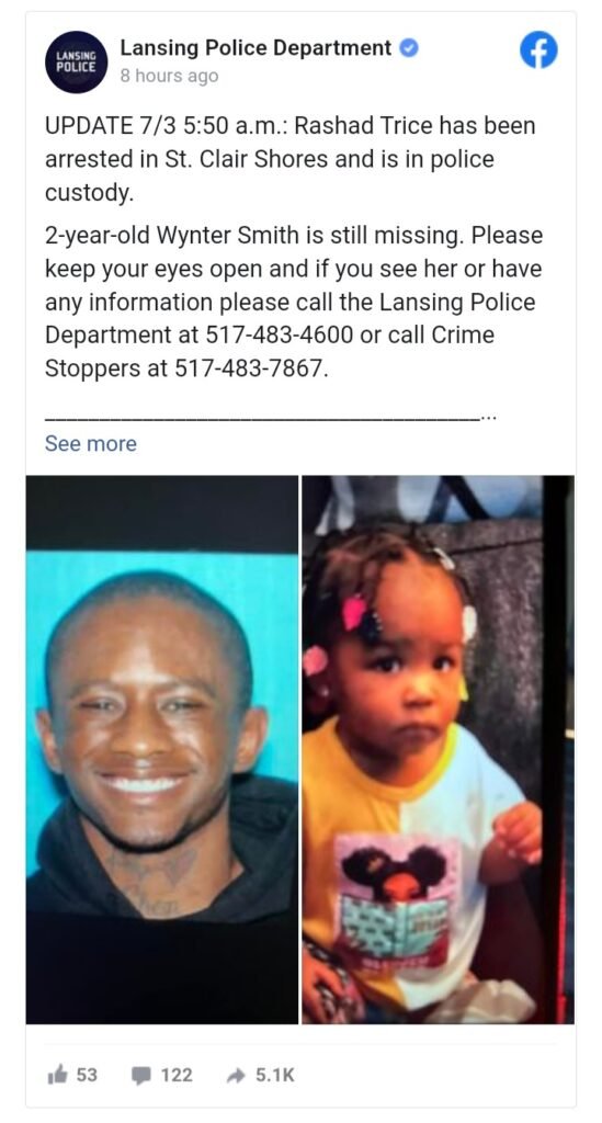 La policía dijo que estaban buscando a Rashad Trice, de 26 años, después de que presuntamente se llevara a Wynter Smith, una niña de 2 años, de Lansing, durante el fin de semana. Habían sido vistos por última vez alrededor de las 11:30 p.m. del 2 de julio.