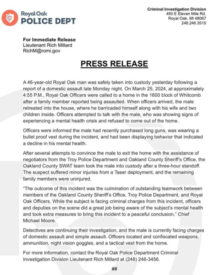 Tras intensas horas de negociación y estrategia, con la ayuda de negociadores del Departamento de Policía de Troy y la Oficina del Sheriff del Condado de Oakland, el equipo SWAT del Condado de Oakland, logró resolver el incidente sin mayores contratiempos alrededor de las 10 p.m., según informes de la policía de Royal Oak difundidos a través de su canal oficial de comunicación.