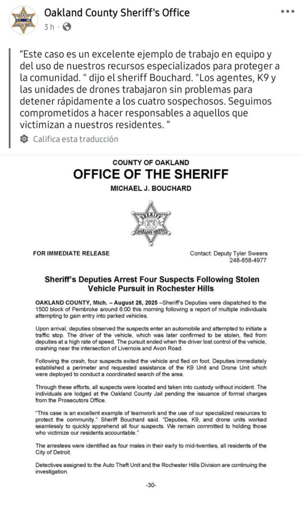 Rochester Hills, MI — Cuatro individuos fueron arrestados el pasado 28 de agosto tras protagonizar una peligrosa persecución en las calles de Rochester Hills, luego de que agentes del sheriff del condado de Oakland detectaran un vehículo robado en la zona de Pontiac.