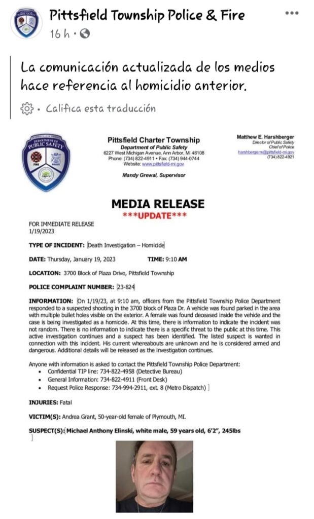 Pittsfield Township, Mich. – La policía del municipio de Pittsfield está buscando a un hombre de 59 años después de que una mujer fue encontrada muerta a tiros en su vehículo el jueves por la mañana.