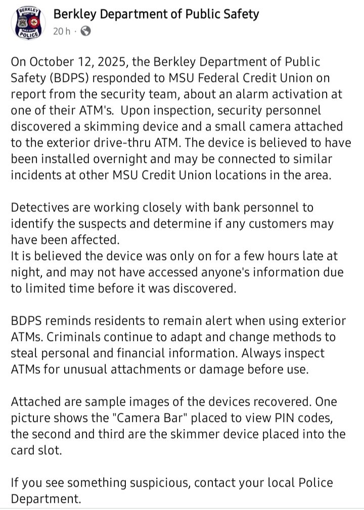 Berkley, MI — Las autoridades locales emitieron una advertencia a la comunidad tras el hallazgo de un dispositivo de clonación de tarjetas, conocido como skimmer, instalado en un cajero automático de la MSU Federal Credit Union, ubicado en la zona de Coolidge Highway.