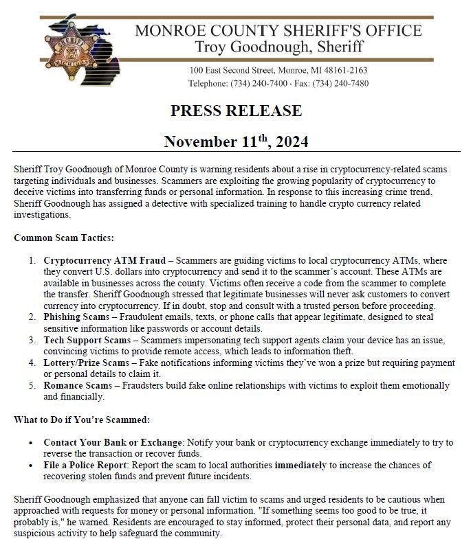 Monroe County, MI- Las autoridades de Michigan han emitido una advertencia urgente sobre el aumento de estafas relacionadas con criptomonedas en el estado. Según los informes, los residentes de Michigan perdieron aproximadamente $80 millones en 2023 debido a estas estafas, lo que representa un incremento significativo en comparación con años anteriores.
