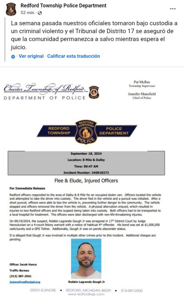 Redford Township, MI – El 18 de septiembre, un hombre identificado como Robbin Lagrande Gough Jr. fue arrestado en Redford Township tras una intensa persecución policial que dejó a dos oficiales heridos. El incidente comenzó cuando la policía recibió un reporte de una camioneta robada en la intersección de Dalby y 8 Mile. Al llegar al lugar, los oficiales intentaron detener a Gough, quien se encontraba al volante del vehículo robado.