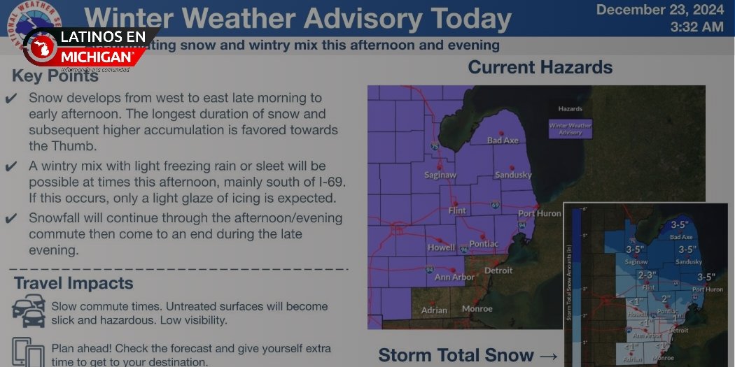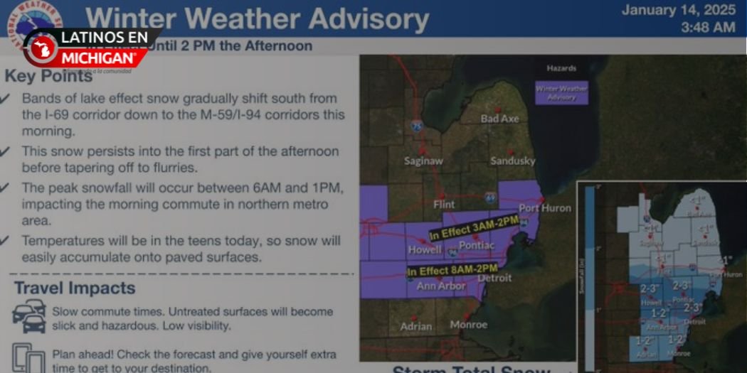 El Servicio Meteorológico Nacional (NWS), ha emitido un aviso de clima invernal para el sureste de Michigan, que estará vigente desde la tarde del viernes hasta la madrugada del sábado.