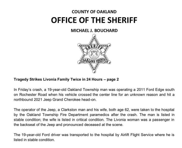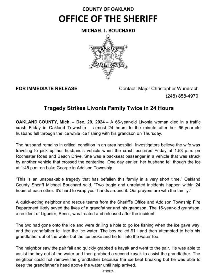 Oakland Twp, MI – Una familia de Livonia ha sido golpeada por dos tragedias en menos de 24 horas. Una mujer de 66 años falleció luego de un accidente automovilístico en Rochester Road y Beach Drive en Oakland Township, casi un día después de que su esposo, también de 66 años, cayera a través del hielo mientras pescaba en el lago George en Addison Township.
