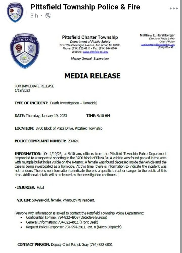 Se solicita a cualquier persona que tenga información que llame al Departamento de Policía del Municipio de Pittsfield. La línea de información confidencial es 734-822-4958.